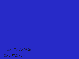 Hex #272ac8 Color is a normal blue color and the nearest color is Persian Blue #1c39bb. Hex code #272ac8 and RGB value is rgb(39,42,200). In RGB color space, this color is composed of 15% red, 16% green, 78% blue, In CMYK color space, this color is composed of 81% cyan, 79% magenta, 0% yellow , 22% black , In HSL color space, this color has a hue angle of 239° , 67% saturation and 47% lightness.