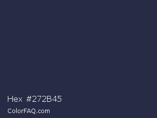 Hex #272b45 Color is a very dark blue color and the nearest color is Ebony Clay #26283b. Hex code #272b45 and RGB value is rgb(39,43,69). In RGB color space, this color is composed of 15% red, 17% green, 27% blue, In CMYK color space, this color is composed of 43% cyan, 38% magenta, 0% yellow , 73% black , In HSL color space, this color has a hue angle of 232° , 28% saturation and 21% lightness.
