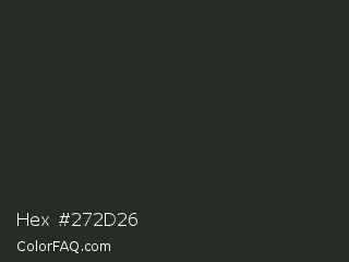 Hex #272d26 Color is a very dark green color and the nearest color is Heavy Metal #2b3228. Hex code #272d26 and RGB value is rgb(39,45,38). In RGB color space, this color is composed of 15% red, 18% green, 15% blue, In CMYK color space, this color is composed of 13% cyan, 0% magenta, 16% yellow , 82% black , In HSL color space, this color has a hue angle of 111° , 8% saturation and 16% lightness.
