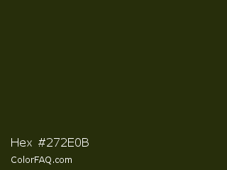 Hex #272e0b Color is a very dark lime color and the nearest color is Turtle Green #2a380b. Hex code #272e0b and RGB value is rgb(39,46,11). In RGB color space, this color is composed of 15% red, 18% green, 4% blue, In CMYK color space, this color is composed of 15% cyan, 0% magenta, 76% yellow , 82% black , In HSL color space, this color has a hue angle of 72° , 61% saturation and 11% lightness.