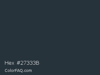 Hex #27333b Color is a very dark blue color and the nearest color is Gunmetal #2a3439. Hex code #27333b and RGB value is rgb(39,51,59). In RGB color space, this color is composed of 15% red, 20% green, 23% blue, In CMYK color space, this color is composed of 34% cyan, 14% magenta, 0% yellow , 77% black , In HSL color space, this color has a hue angle of 204° , 20% saturation and 19% lightness.