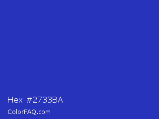 Hex #2733ba Color is a normal blue color and the nearest color is Persian Blue #1c39bb. Hex code #2733ba and RGB value is rgb(39,51,186). In RGB color space, this color is composed of 15% red, 20% green, 73% blue, In CMYK color space, this color is composed of 79% cyan, 73% magenta, 0% yellow , 27% black , In HSL color space, this color has a hue angle of 235° , 65% saturation and 44% lightness.