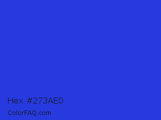 Hex #273ae0 Color is a normal blue color and the nearest color is Palatinate Blue #273be2. Hex code #273ae0 and RGB value is rgb(39,58,224). In RGB color space, this color is composed of 15% red, 23% green, 88% blue, In CMYK color space, this color is composed of 83% cyan, 74% magenta, 0% yellow , 12% black , In HSL color space, this color has a hue angle of 234° , 75% saturation and 52% lightness.