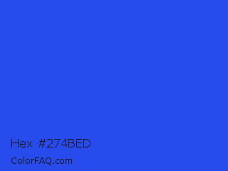 Hex #274bed Color is a normal blue color and the nearest color is Palatinate Blue #273be2. Hex code #274bed and RGB value is rgb(39,75,237). In RGB color space, this color is composed of 15% red, 29% green, 93% blue, In CMYK color space, this color is composed of 84% cyan, 68% magenta, 0% yellow , 7% black , In HSL color space, this color has a hue angle of 229° , 85% saturation and 54% lightness.