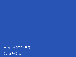 Hex #2754b5 Color is a normal blue color and the nearest color is Cerulean Blue #2a52be. Hex code #2754b5 and RGB value is rgb(39,84,181). In RGB color space, this color is composed of 15% red, 33% green, 71% blue, In CMYK color space, this color is composed of 78% cyan, 54% magenta, 0% yellow , 29% black , In HSL color space, this color has a hue angle of 221° , 65% saturation and 43% lightness.