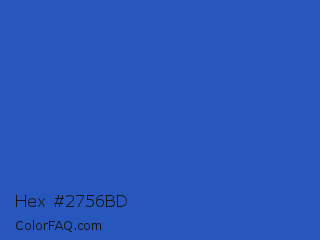 Hex #2756bd Color is a normal blue color and the nearest color is Cerulean Blue #2a52be. Hex code #2756bd and RGB value is rgb(39,86,189). In RGB color space, this color is composed of 15% red, 34% green, 74% blue, In CMYK color space, this color is composed of 79% cyan, 54% magenta, 0% yellow , 26% black , In HSL color space, this color has a hue angle of 221° , 66% saturation and 45% lightness.