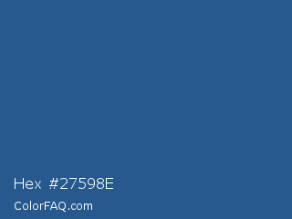 Hex #27598e Color is a normal blue color and the nearest color is B Dazzled Blue #2e5894. Hex code #27598e and RGB value is rgb(39,89,142). In RGB color space, this color is composed of 15% red, 35% green, 56% blue, In CMYK color space, this color is composed of 73% cyan, 37% magenta, 0% yellow , 44% black , In HSL color space, this color has a hue angle of 211° , 57% saturation and 35% lightness.