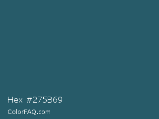 Hex #275b69 Color is a dark cyan color and the nearest color is Casal #2f6168. Hex code #275b69 and RGB value is rgb(39,91,105). In RGB color space, this color is composed of 15% red, 36% green, 41% blue, In CMYK color space, this color is composed of 63% cyan, 13% magenta, 0% yellow , 59% black , In HSL color space, this color has a hue angle of 193° , 46% saturation and 28% lightness.