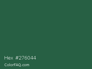 Hex #276044 Color is a dark green color and the nearest color is Green Pea #1d6142. Hex code #276044 and RGB value is rgb(39,96,68). In RGB color space, this color is composed of 15% red, 38% green, 27% blue, In CMYK color space, this color is composed of 59% cyan, 0% magenta, 29% yellow , 62% black , In HSL color space, this color has a hue angle of 151° , 42% saturation and 26% lightness.