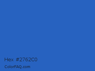 Hex #2762c0 Color is a normal blue color and the nearest color is Mariner #286acd. Hex code #2762c0 and RGB value is rgb(39,98,192). In RGB color space, this color is composed of 15% red, 38% green, 75% blue, In CMYK color space, this color is composed of 80% cyan, 49% magenta, 0% yellow , 25% black , In HSL color space, this color has a hue angle of 217° , 66% saturation and 45% lightness.