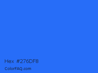 Hex #276df8 Color is a normal blue color and the nearest color is Blue Crayola #1f75fe. Hex code #276df8 and RGB value is rgb(39,109,248). In RGB color space, this color is composed of 15% red, 43% green, 97% blue, In CMYK color space, this color is composed of 84% cyan, 56% magenta, 0% yellow , 3% black , In HSL color space, this color has a hue angle of 220° , 94% saturation and 56% lightness.