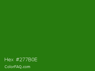 Hex #277b0e Color is a dark green color and the nearest color is Bilbao #327c14. Hex code #277b0e and RGB value is rgb(39,123,14). In RGB color space, this color is composed of 15% red, 48% green, 5% blue, In CMYK color space, this color is composed of 68% cyan, 0% magenta, 89% yellow , 52% black , In HSL color space, this color has a hue angle of 106° , 80% saturation and 27% lightness.