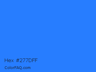 Hex #277dff Color is a normal blue color and the nearest color is Blue Crayola #1f75fe. Hex code #277dff and RGB value is rgb(39,125,255). In RGB color space, this color is composed of 15% red, 49% green, 100% blue, In CMYK color space, this color is composed of 85% cyan, 51% magenta, 0% yellow , 0% black , In HSL color space, this color has a hue angle of 216° , 100% saturation and 58% lightness.