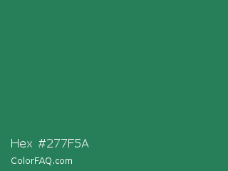 Hex #277f5a Color is a normal green color and the nearest color is Eucalyptus #278a5b. Hex code #277f5a and RGB value is rgb(39,127,90). In RGB color space, this color is composed of 15% red, 50% green, 35% blue, In CMYK color space, this color is composed of 69% cyan, 0% magenta, 29% yellow , 50% black , In HSL color space, this color has a hue angle of 155° , 53% saturation and 33% lightness.