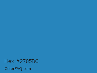 Hex #2785bc Color is a normal blue color and the nearest color is Cyan Cornflower Blue #188bc2. Hex code #2785bc and RGB value is rgb(39,133,188). In RGB color space, this color is composed of 15% red, 52% green, 74% blue, In CMYK color space, this color is composed of 79% cyan, 29% magenta, 0% yellow , 26% black , In HSL color space, this color has a hue angle of 202° , 66% saturation and 45% lightness.