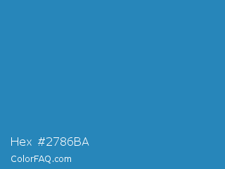 Hex #2786ba Color is a normal blue color and the nearest color is Cyan Cornflower Blue #188bc2. Hex code #2786ba and RGB value is rgb(39,134,186). In RGB color space, this color is composed of 15% red, 53% green, 73% blue, In CMYK color space, this color is composed of 79% cyan, 28% magenta, 0% yellow , 27% black , In HSL color space, this color has a hue angle of 201° , 65% saturation and 44% lightness.