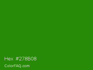 Hex #278b08 Color is a dark green color and the nearest color is Napier Green #2a8000. Hex code #278b08 and RGB value is rgb(39,139,8). In RGB color space, this color is composed of 15% red, 55% green, 3% blue, In CMYK color space, this color is composed of 72% cyan, 0% magenta, 94% yellow , 45% black , In HSL color space, this color has a hue angle of 106° , 89% saturation and 29% lightness.