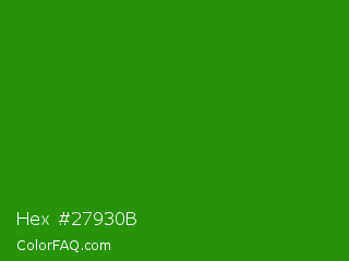 Hex #27930b Color is a normal green color and the nearest color is Slimy Green #299617. Hex code #27930b and RGB value is rgb(39,147,11). In RGB color space, this color is composed of 15% red, 58% green, 4% blue, In CMYK color space, this color is composed of 73% cyan, 0% magenta, 93% yellow , 42% black , In HSL color space, this color has a hue angle of 108° , 86% saturation and 31% lightness.