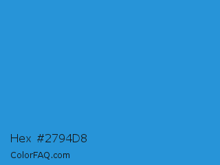 Hex #2794d8 Color is a normal blue color and the nearest color is Curious Blue #2596d1. Hex code #2794d8 and RGB value is rgb(39,148,216). In RGB color space, this color is composed of 15% red, 58% green, 85% blue, In CMYK color space, this color is composed of 82% cyan, 31% magenta, 0% yellow , 15% black , In HSL color space, this color has a hue angle of 203° , 69% saturation and 50% lightness.