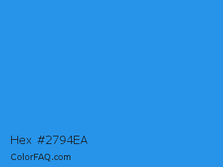 Hex #2794ea Color is a normal blue color and the nearest color is Button Blue #24a0ed. Hex code #2794ea and RGB value is rgb(39,148,234). In RGB color space, this color is composed of 15% red, 58% green, 92% blue, In CMYK color space, this color is composed of 83% cyan, 37% magenta, 0% yellow , 8% black , In HSL color space, this color has a hue angle of 206° , 82% saturation and 54% lightness.