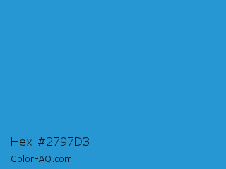 Hex #2797d3 Color is a normal blue color and the nearest color is Curious Blue #2596d1. Hex code #2797d3 and RGB value is rgb(39,151,211). In RGB color space, this color is composed of 15% red, 59% green, 83% blue, In CMYK color space, this color is composed of 82% cyan, 28% magenta, 0% yellow , 17% black , In HSL color space, this color has a hue angle of 201° , 69% saturation and 49% lightness.