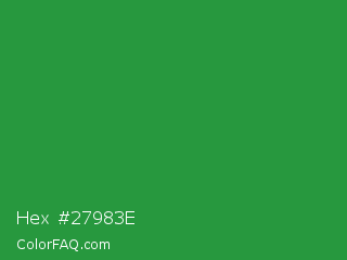 Hex #27983e Color is a normal green color and the nearest color is Sea Green #2e8b57. Hex code #27983e and RGB value is rgb(39,152,62). In RGB color space, this color is composed of 15% red, 60% green, 24% blue, In CMYK color space, this color is composed of 74% cyan, 0% magenta, 59% yellow , 40% black , In HSL color space, this color has a hue angle of 132° , 59% saturation and 37% lightness.