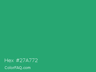 Hex #27a772 Color is a normal green color and the nearest color is Green Crayola #1cac78. Hex code #27a772 and RGB value is rgb(39,167,114). In RGB color space, this color is composed of 15% red, 65% green, 45% blue, In CMYK color space, this color is composed of 77% cyan, 0% magenta, 32% yellow , 35% black , In HSL color space, this color has a hue angle of 155° , 62% saturation and 40% lightness.