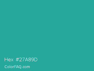 Hex #27a89d Color is a normal cyan color and the nearest color is Light Sea Green #20b2aa. Hex code #27a89d and RGB value is rgb(39,168,157). In RGB color space, this color is composed of 15% red, 66% green, 62% blue, In CMYK color space, this color is composed of 77% cyan, 0% magenta, 7% yellow , 34% black , In HSL color space, this color has a hue angle of 175° , 62% saturation and 41% lightness.