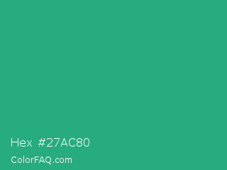 Hex #27ac80 Color is a normal green color and the nearest color is Jungle Green #29ab87. Hex code #27ac80 and RGB value is rgb(39,172,128). In RGB color space, this color is composed of 15% red, 67% green, 50% blue, In CMYK color space, this color is composed of 77% cyan, 0% magenta, 26% yellow , 33% black , In HSL color space, this color has a hue angle of 160° , 63% saturation and 41% lightness.