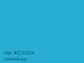 Hex #27acd4 Color is a normal blue color and the nearest color is Ball Blue #21abcd. Hex code #27acd4 and RGB value is rgb(39,172,212). In RGB color space, this color is composed of 15% red, 67% green, 83% blue, In CMYK color space, this color is composed of 82% cyan, 19% magenta, 0% yellow , 17% black , In HSL color space, this color has a hue angle of 194° , 69% saturation and 49% lightness.