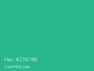 Hex #27b78b Color is a normal green color and the nearest color is Mountain Meadow #30ba8f. Hex code #27b78b and RGB value is rgb(39,183,139). In RGB color space, this color is composed of 15% red, 72% green, 55% blue, In CMYK color space, this color is composed of 79% cyan, 0% magenta, 24% yellow , 28% black , In HSL color space, this color has a hue angle of 162° , 65% saturation and 44% lightness.