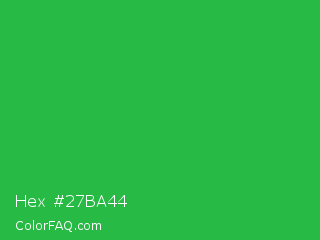 Hex #27ba44 Color is a normal green color and the nearest color is Wageningen Green #34b233. Hex code #27ba44 and RGB value is rgb(39,186,68). In RGB color space, this color is composed of 15% red, 73% green, 27% blue, In CMYK color space, this color is composed of 79% cyan, 0% magenta, 63% yellow , 27% black , In HSL color space, this color has a hue angle of 132° , 65% saturation and 44% lightness.