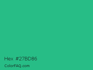 Hex #27bd86 Color is a normal green color and the nearest color is Mountain Meadow #30ba8f. Hex code #27bd86 and RGB value is rgb(39,189,134). In RGB color space, this color is composed of 15% red, 74% green, 53% blue, In CMYK color space, this color is composed of 79% cyan, 0% magenta, 29% yellow , 26% black , In HSL color space, this color has a hue angle of 158° , 66% saturation and 45% lightness.