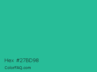 Hex #27bd98 Color is a normal cyan color and the nearest color is Mountain Meadow #30ba8f. Hex code #27bd98 and RGB value is rgb(39,189,152). In RGB color space, this color is composed of 15% red, 74% green, 60% blue, In CMYK color space, this color is composed of 79% cyan, 0% magenta, 20% yellow , 26% black , In HSL color space, this color has a hue angle of 165° , 66% saturation and 45% lightness.