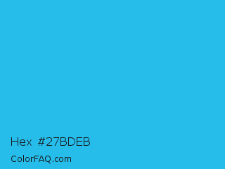 Hex #27bdeb Color is a normal blue color and the nearest color is Scooter #2ebfd4. Hex code #27bdeb and RGB value is rgb(39,189,235). In RGB color space, this color is composed of 15% red, 74% green, 92% blue, In CMYK color space, this color is composed of 83% cyan, 20% magenta, 0% yellow , 8% black , In HSL color space, this color has a hue angle of 194° , 83% saturation and 54% lightness.