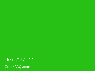 Hex #27c115 Color is a normal green color and the nearest color is Harlequin Green #46cb18. Hex code #27c115 and RGB value is rgb(39,193,21). In RGB color space, this color is composed of 15% red, 76% green, 8% blue, In CMYK color space, this color is composed of 80% cyan, 0% magenta, 89% yellow , 24% black , In HSL color space, this color has a hue angle of 114° , 80% saturation and 42% lightness.