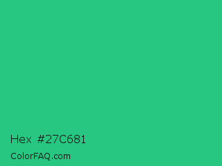 Hex #27c681 Color is a normal green color and the nearest color is Mountain Meadow #30ba8f. Hex code #27c681 and RGB value is rgb(39,198,129). In RGB color space, this color is composed of 15% red, 78% green, 51% blue, In CMYK color space, this color is composed of 80% cyan, 0% magenta, 35% yellow , 22% black , In HSL color space, this color has a hue angle of 154° , 67% saturation and 46% lightness.