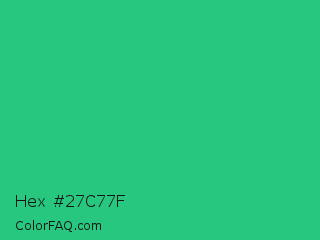 Hex #27c77f Color is a normal green color and the nearest color is Mountain Meadow #30ba8f. Hex code #27c77f and RGB value is rgb(39,199,127). In RGB color space, this color is composed of 15% red, 78% green, 50% blue, In CMYK color space, this color is composed of 80% cyan, 0% magenta, 36% yellow , 22% black , In HSL color space, this color has a hue angle of 153° , 67% saturation and 47% lightness.