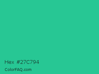 Hex #27c794 Color is a normal green color and the nearest color is Shamrock #33cc99. Hex code #27c794 and RGB value is rgb(39,199,148). In RGB color space, this color is composed of 15% red, 78% green, 58% blue, In CMYK color space, this color is composed of 80% cyan, 0% magenta, 26% yellow , 22% black , In HSL color space, this color has a hue angle of 161° , 67% saturation and 47% lightness.