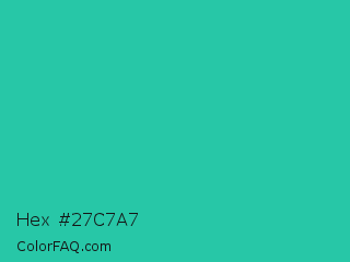 Hex #27c7a7 Color is a normal cyan color and the nearest color is Shamrock #33cc99. Hex code #27c7a7 and RGB value is rgb(39,199,167). In RGB color space, this color is composed of 15% red, 78% green, 65% blue, In CMYK color space, this color is composed of 80% cyan, 0% magenta, 16% yellow , 22% black , In HSL color space, this color has a hue angle of 168° , 67% saturation and 47% lightness.