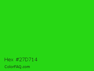 Hex #27d714 Color is a normal green color and the nearest color is Harlequin Green #46cb18. Hex code #27d714 and RGB value is rgb(39,215,20). In RGB color space, this color is composed of 15% red, 84% green, 8% blue, In CMYK color space, this color is composed of 82% cyan, 0% magenta, 91% yellow , 16% black , In HSL color space, this color has a hue angle of 114° , 83% saturation and 46% lightness.