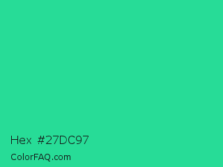 Hex #27dc97 Color is a normal green color and the nearest color is Shamrock #33cc99. Hex code #27dc97 and RGB value is rgb(39,220,151). In RGB color space, this color is composed of 15% red, 86% green, 59% blue, In CMYK color space, this color is composed of 82% cyan, 0% magenta, 31% yellow , 14% black , In HSL color space, this color has a hue angle of 157° , 72% saturation and 51% lightness.