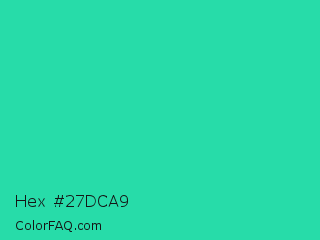 Hex #27dca9 Color is a normal green color and the nearest color is Shamrock #33cc99. Hex code #27dca9 and RGB value is rgb(39,220,169). In RGB color space, this color is composed of 15% red, 86% green, 66% blue, In CMYK color space, this color is composed of 82% cyan, 0% magenta, 23% yellow , 14% black , In HSL color space, this color has a hue angle of 163° , 72% saturation and 51% lightness.