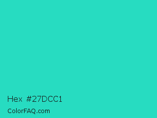 Hex #27dcc1 Color is a normal cyan color and the nearest color is Turquoise PWG #30d5c8. Hex code #27dcc1 and RGB value is rgb(39,220,193). In RGB color space, this color is composed of 15% red, 86% green, 76% blue, In CMYK color space, this color is composed of 82% cyan, 0% magenta, 12% yellow , 14% black , In HSL color space, this color has a hue angle of 171° , 72% saturation and 51% lightness.