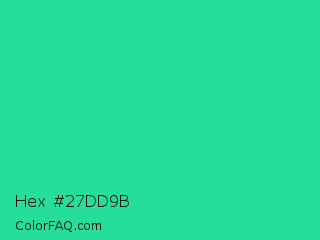 Hex #27dd9b Color is a normal green color and the nearest color is Shamrock #33cc99. Hex code #27dd9b and RGB value is rgb(39,221,155). In RGB color space, this color is composed of 15% red, 87% green, 61% blue, In CMYK color space, this color is composed of 82% cyan, 0% magenta, 30% yellow , 13% black , In HSL color space, this color has a hue angle of 158° , 73% saturation and 51% lightness.