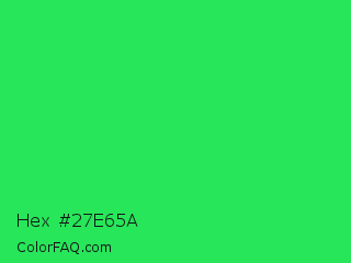 Hex #27e65a Color is a normal green color and the nearest color is Malachite #0bda51. Hex code #27e65a and RGB value is rgb(39,230,90). In RGB color space, this color is composed of 15% red, 90% green, 35% blue, In CMYK color space, this color is composed of 83% cyan, 0% magenta, 61% yellow , 10% black , In HSL color space, this color has a hue angle of 136° , 79% saturation and 53% lightness.