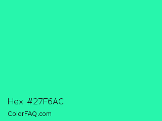 Hex #27f6ac Color is a normal green color and the nearest color is Eucalyptus #44d7a8. Hex code #27f6ac and RGB value is rgb(39,246,172). In RGB color space, this color is composed of 15% red, 96% green, 67% blue, In CMYK color space, this color is composed of 84% cyan, 0% magenta, 30% yellow , 4% black , In HSL color space, this color has a hue angle of 159° , 92% saturation and 56% lightness.