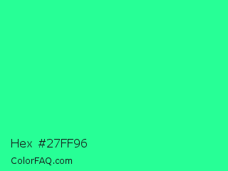Hex #27ff96 Color is a normal green color and the nearest color is Medium Spring Green #00fa9a. Hex code #27ff96 and RGB value is rgb(39,255,150). In RGB color space, this color is composed of 15% red, 100% green, 59% blue, In CMYK color space, this color is composed of 85% cyan, 0% magenta, 41% yellow , 0% black , In HSL color space, this color has a hue angle of 151° , 100% saturation and 58% lightness.