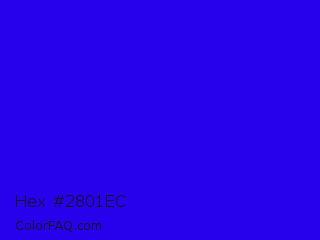 Hex #2801ec Color is a normal indigo color and the nearest color is Bluebonnet #1c1cf0. Hex code #2801ec and RGB value is rgb(40,1,236). In RGB color space, this color is composed of 16% red, 0% green, 93% blue, In CMYK color space, this color is composed of 83% cyan, 100% magenta, 0% yellow , 7% black , In HSL color space, this color has a hue angle of 250° , 99% saturation and 46% lightness.