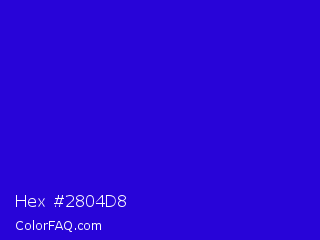 Hex #2804d8 Color is a normal indigo color and the nearest color is Interdimensional Blue #360ccc. Hex code #2804d8 and RGB value is rgb(40,4,216). In RGB color space, this color is composed of 16% red, 2% green, 85% blue, In CMYK color space, this color is composed of 81% cyan, 98% magenta, 0% yellow , 15% black , In HSL color space, this color has a hue angle of 250° , 96% saturation and 43% lightness.